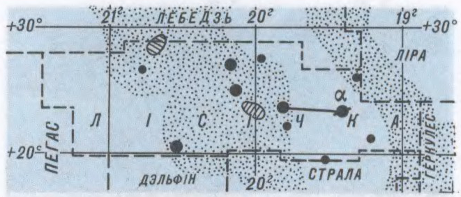 сузор’е Паўн. паўшар’я неба. Адсутнічаюць зоркі ярчэй 4,4 візуальнай зорнай велічыні. На тэр.Беларусі відаць круглы год, найлепш у ліпені. Гл.Зорнае неба.
