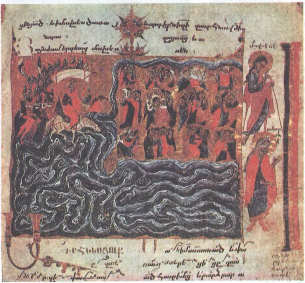 Да арт.Кілікійская школа мініяцюры. Тарос Раслін. Пераход яўрэяў праз Чырвонае мора. Мініяцюра з «Чашоца» Хетума II. 1286.