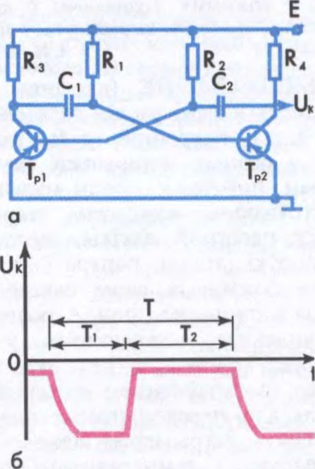 Схема сіметрычнага мультывібратара (а) і сігналы (б), што ім генерыруюцца: Tp1, Tp2 — транзістары; C1, C2 — кандэнсатары; R1—R4 — рэзістары; E — напружанне крыніцы сілкавання; UK — напружанне на калектары (выхадны сігнал); T — перыяд ваганняў; T1, T2 — працягласць рабочых тактаў.