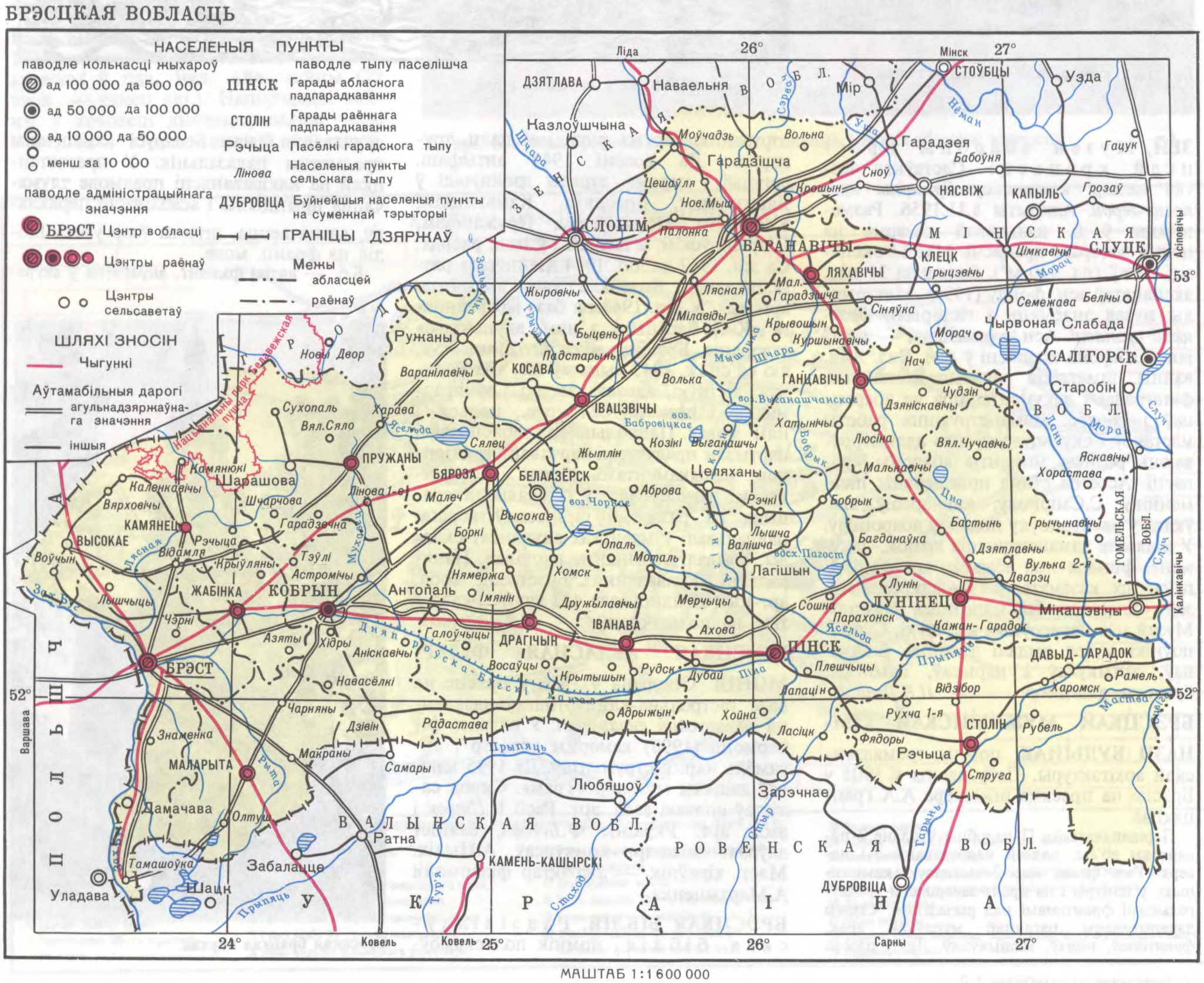 Насельніцтва. Асн. насельніцтва беларусы (84,6%), жывуць таксама рускія (9,2%), украінцы (3%), палякі (2,5%), яўрэі (0,3%) і інш. Гарадскога нас. 60,4%. Сярэдняя шчыльн. 46,4 чал. на 1 км², сельскага нас. 18,4 чал. на 1 км² і вагаецца ад 25,3 чал. на 1 км² у Брэсцкім да 13,3 чал. на 1 км² у Ганцавіцкім і Маларыцкім р-нах. Найб. гарады (тыс.чал., 1995): Брэст (294,3), Баранавічы (172,9), Пінск (130,3), Кобрын (51,1), Бяроза (30,5), Пружаны (25,2), Лунінец (24,9). У 1985—95 зніжаюцца нараджальнасць і натуральны прырост, расце смяротнасць, павялічваецца доля асоб, старэйшых за працаздольны ўзрост, адзначаецца адмоўны натуральны прырост сельскага насельніцтва.