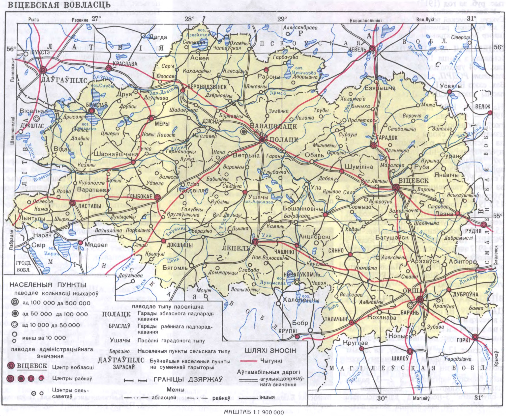 Насельніцтва. Асн. насельніцтва — беларусы (81,8%), жывуць таксама рускія (13,5%), украінцы (1,7%), палякі (1,2%), яўрэі (1,1%) і інш. Гарадскога нас. 66,3%. Сярэдняя шчыльн. 36 чал. на 1 км², сельскага — 12 чал. на 1 км². Па адм. раёнах шчыльнасць насельніцтва вагаецца ад 30 чал. на 1 км² у Чашніцкім да 8 чал. на 1 км² у Расонскім р-не. Найб. гарады (тыс.чал., 1995): Віцебск 365, Орша 139, Наваполацк 97, Полацк 88. З 1991 натуральны прырост насельніцтва, а з 1994 міграцыйнае сальда сталі адмоўныя, адбываецца абсалютнае скарачэнне колькасці насельніцтва, а ў сельскай мясцовасці яшчэ яго старэнне.