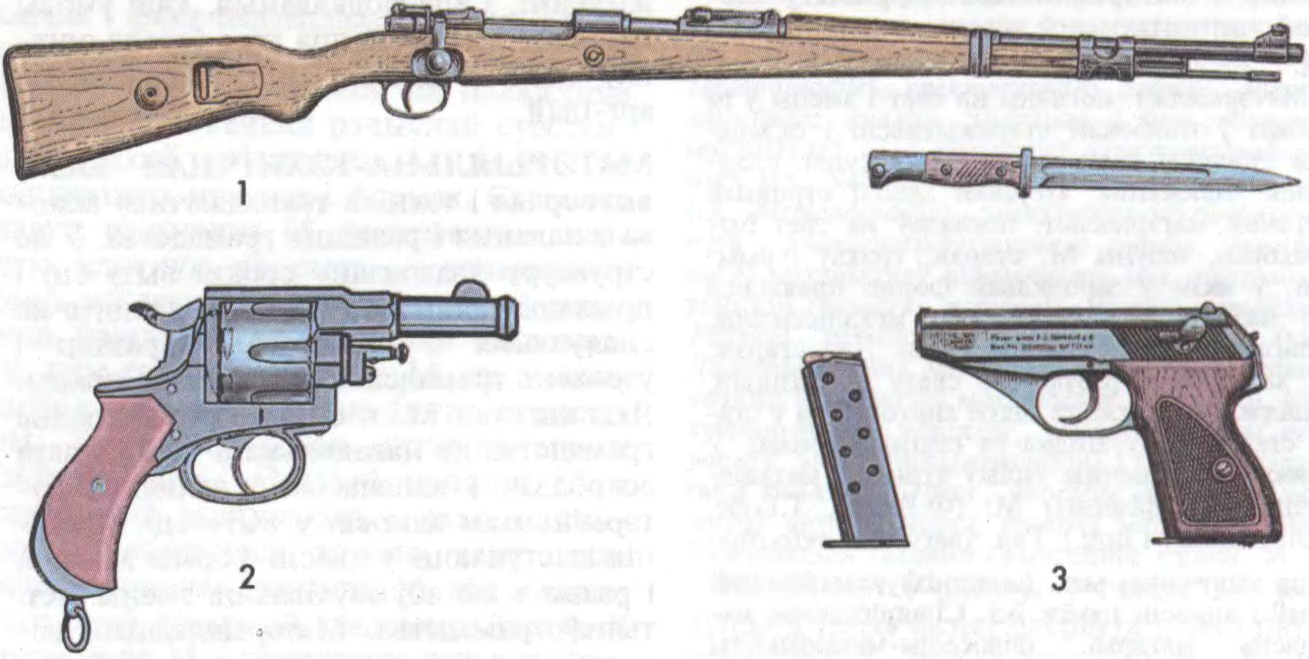 Зброя сістэмы маўзер: 1 — карабін са штыком; 2 — рэвальвер узору 1871—83; 3 — пісталет узору 1937 (мадэль HSc) з абоймай.