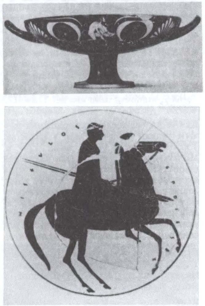 старажытнагрэчаская гліняная ці металічная пасудзіна для ўжывання віна: плоская шырокая чаша на высокай ножцы з падножкай і дзвюма