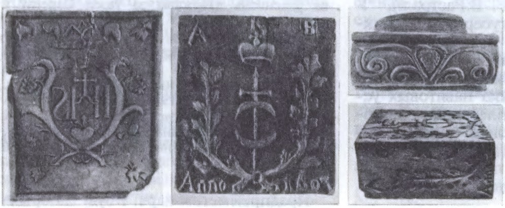 Да арт.Зэльвенская кафля Кафлі: злева — з выявамі гербаў 17 ст. і 1603; справа — паясная 17 ст.; вуглавая пач. 17 ст.