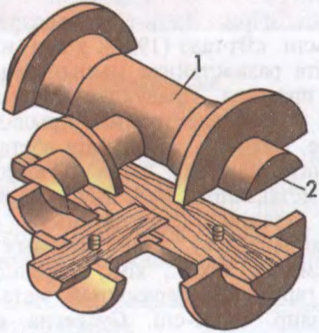 Раздымная ліцейная мадэль са стрыжнёвымі знакамі: 1 — палова мадэлі; 2 — стрыжнёвы знак.