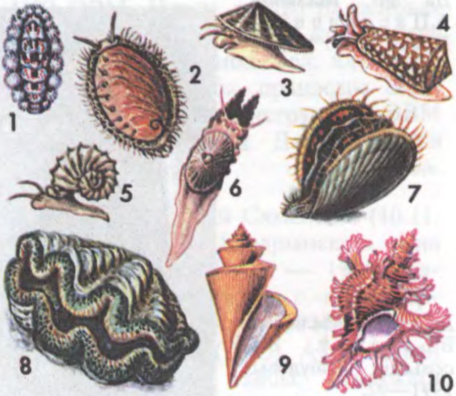 Малюскі: 1 — акантахітон; 2 — марское вушка; 3 — патэла чарнаморская; 4 — конус мармуровы; 5 — катушка-грэбень; 6 — фісурэла; 7 — японскі грабеньчык Фарэра; 8 — трыдакна гіганцкая; 9 — ракавіна татхерыі дзіўнай; 10 — ракавіна мурэкса пальма-розы.
