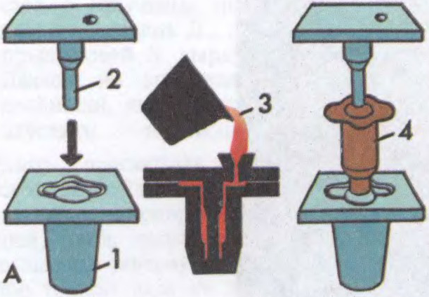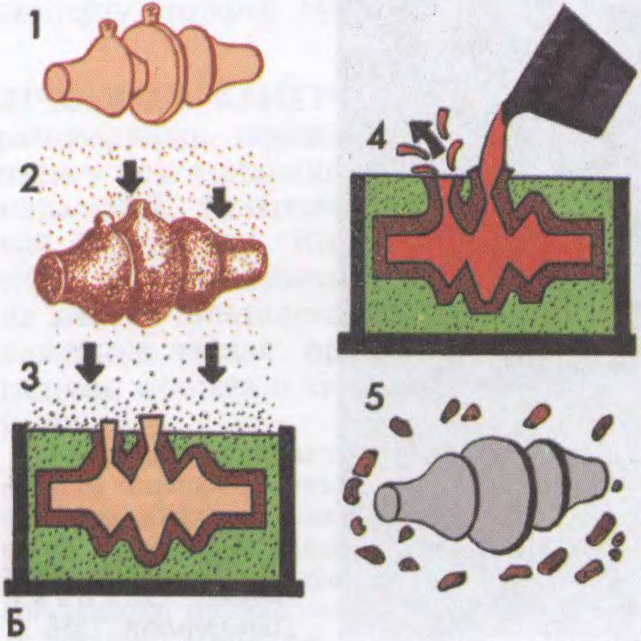 Да арт. Ліццё. А — ліццё ў какіль: 1 — какіль; 2 — стрыжань; 3 — метал; 4 — адліўка. Б — дакладнае ліццё па выплаўляльных мадэлях: 1 — васковая мадэль; 2 — нанясенне на мадэль слоя керамічнага парашку; 3 — зафармоўванне мадэлі ў апоку; 4 — заліўка металу, які расплаўляе воск і займае яго месца; 5 — ачыстка гатовай адліўкі.