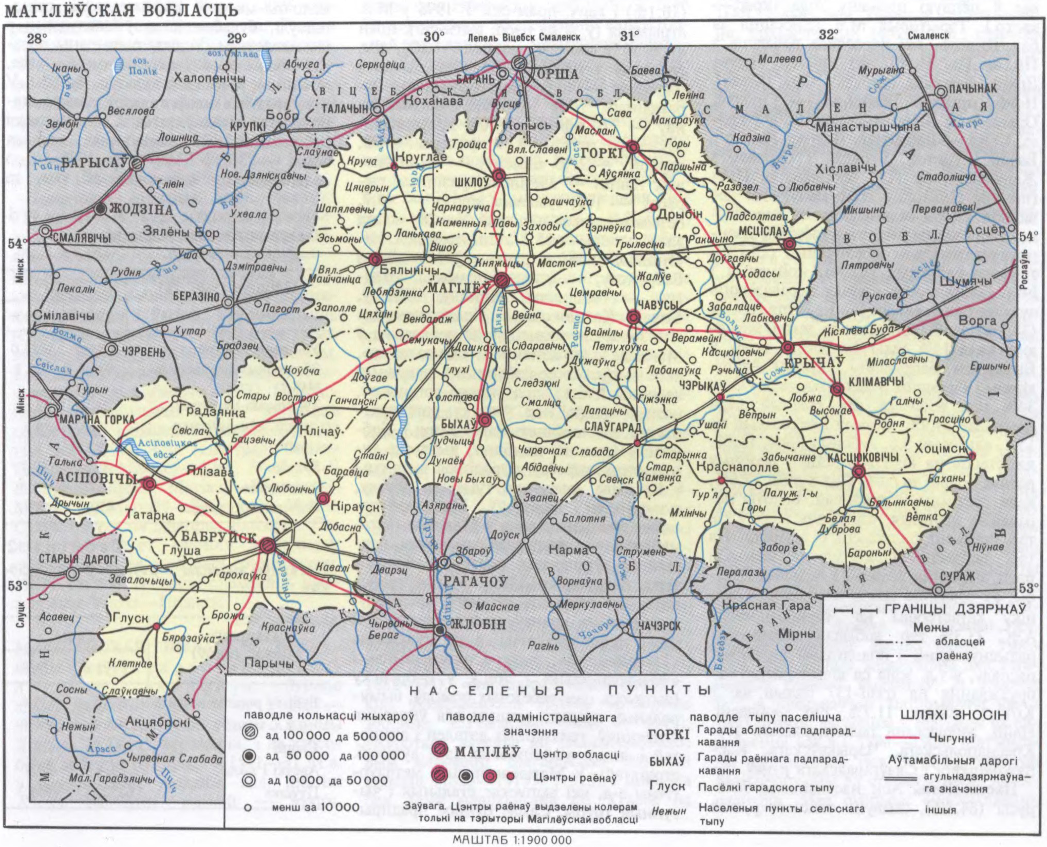 Насельніцтва. Асн. насельніцтва беларусы (84,3%), жывуць таксама рускія (11,1%), украінцы (1,9%) і інш. Гарадскога насельніцтва 70,4% (1998). Сярэдняя шчыльн. 42,8 чал. на 1 км², сельскага насельніцтва 12,7 чал. на 1 км². Найб. гарады (тыс. чал., 1998): Магілёў (369), Бабруйск (227), Асіповічы (33,8), Горкі (33,5). Колькасць насельніцтва мае тэндэнцыю да памяншэння (з 1992 смяротнасць насельніцтва перавышае нараджальнасць), павялічваецца доля асоб, старэйшых за працаздольны ўзрост. З 1986 насельніцтва ў Краснапольскім, Касцюковіцкім, Слаўгарадскім і Чэрыкаўскім р-нах (найб. пацярпелі ад катастрофы на Чарнобыльскай АЭС) паменшылася на 40—50%.