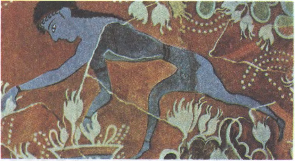 Да арт.Крыта-мікенская культура. Ільвіныя вароты ў Мікенах. Рэльеф. 13 ст. да н.э.Да арт.Крыта-мікенская культура. Маска з грабніцы VI магільнага круга «А» ў Мікенах. 16 ст. да н.э.Да арт.Крыта-мікенская культура. Зборшчык шафрану. Фрагмент фрэскі з Кноскага палаца. 1700—1600 да н.э.
