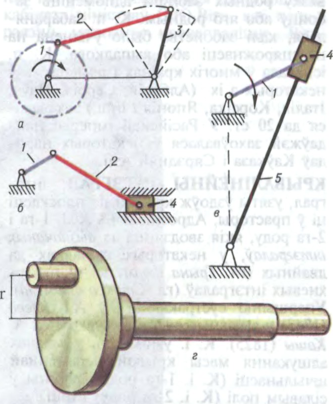 Плоскія крывашыпныя механізмы: а — крывашыпна-каромыславы; б — крывашыпна-паўзунны; в — крывашыпна-кулісны; г — крывашып з пастаянным радыусам r; 1 — крывашып; 2 — шатун; 3 — каромысел; 4 — паўзун; 5 — куліса.
