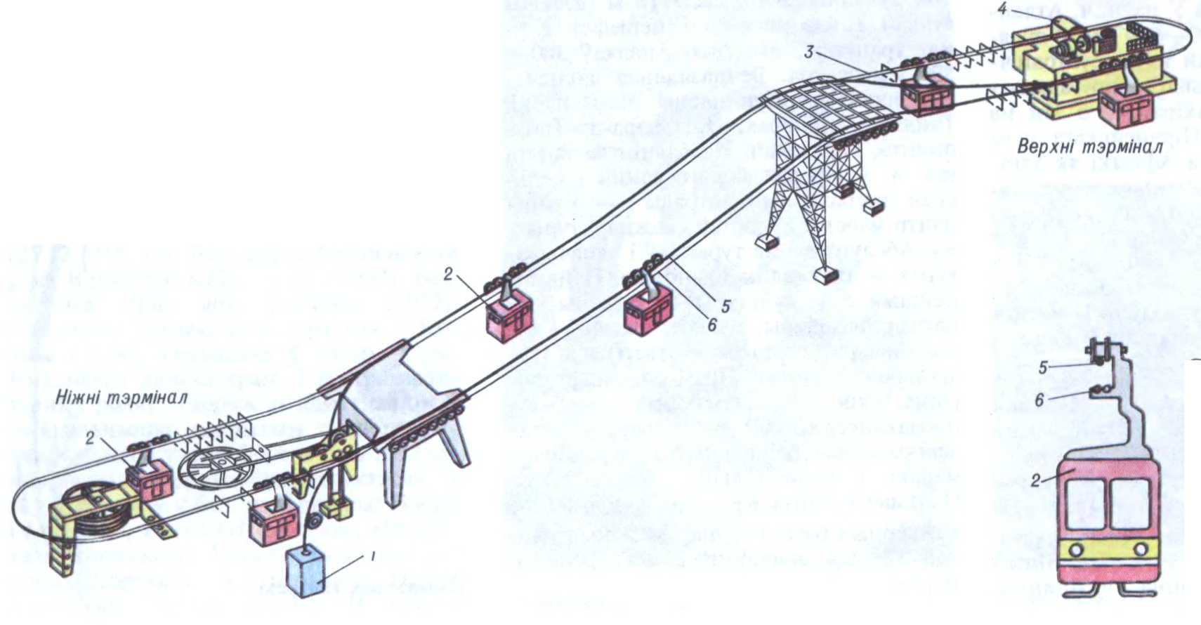 Схема падвеснай канатнай дарогі: 1 — механізм нацяжэння канатаў; 2 — вагоны; 3 — накіравальная рэйка для зняцця вагонаў з канатаў; 4 — лябёдка; 5 — нерухомы канат, па якім коцяцца вагонныя колы; 6 — рухомы канат, які цягне вагоны паміж станцыямі.