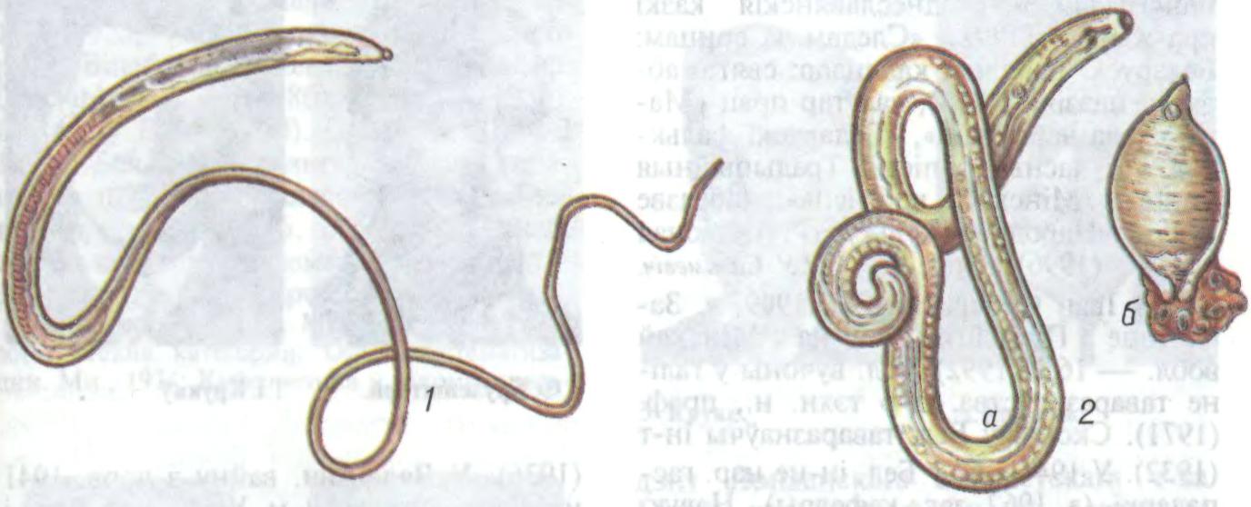 Да арт.Круглыя чэрві: 1 — воласагалоў чалавечы; 2 — нематода бурачная разнаскурая (а — самец, б — самка).