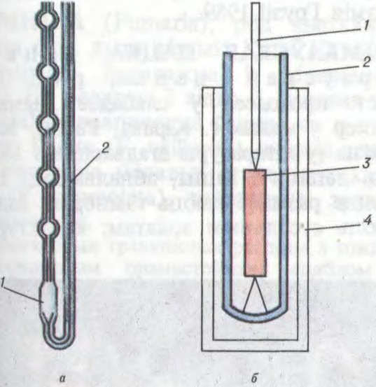 Дылатометры: а — вадкасны (1 — рэзервуар; 2 — калібраваны капіляр); б — кварцавы (1 — штурхач; 2 — трымальнік; 3 — узор; 4 — награвальнік або халадзільнік).