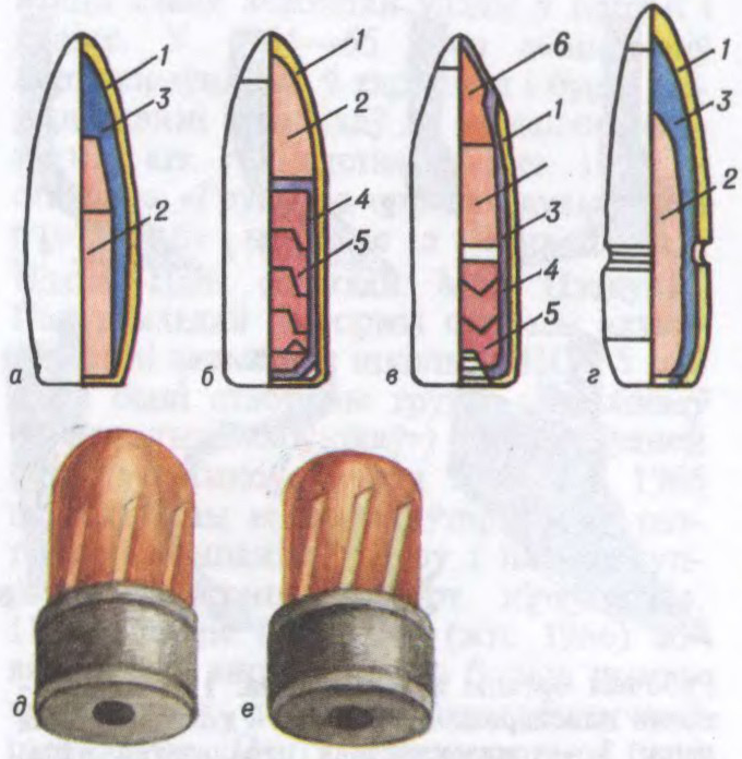 Кулі для стралковай (а—е) і гладкаствольнай паляўнічай (д—е) зброі: а — звычайная, б — трасіруючая, в — запальная, г — бранябойная, д — Якана (Жакана), е — Брэнеке; 1 — абалонка, 2 — асяродак, 3 — свінцовая абалонка, 4 — стаканчык, 5—6 — трасіруючы і запальны саставы.