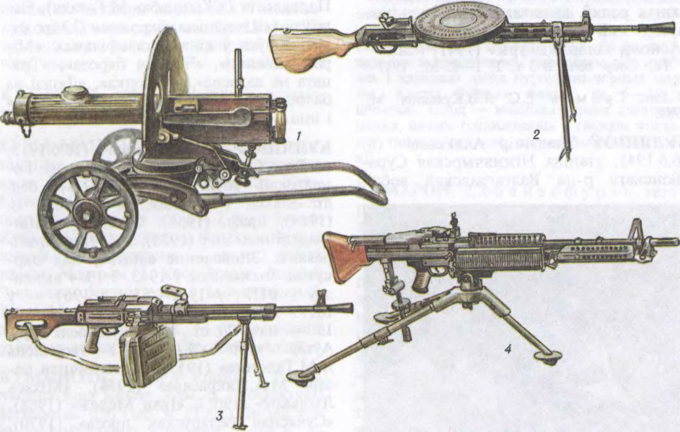Кулямёты: 1 — станковы Х.С.Максіма ўзору 1910; 2 — ручны В.А.Дзегцярова; 3 — адзіны М.Ц.Калашнікава на сошках; 4 — амерыканскі адзіны на станку.