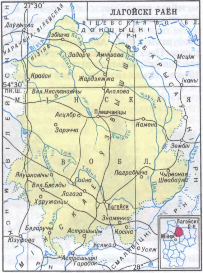 ЛАГО́ЙСКІ РАЁН На Пн Мінскай вобл. Утвораны 17.7.1924, канчаткова сфарміраваны 14.8.1979. Пл. 2,4 тыс.км2. Нас. 43,5 тыс.чал. (1998), гарадскога 41%. Сярэдняя шчыльн. 18 чал. на 1 км2. Цэнтр раёна — г.Лагойск. Уключае г.п.Плешчаніцы, 323 сельскія населеныя пункты. Падзяляецца на 16 сельсаветаў: Акалоўскі, Акцябрскі, Астрошыцкі, Бяларуцкі, Гайненскі, Задор’еўскі, Зарэчанскі, Знаменкаўскі, Ізбішчанскі, Каменскі, Крайскі, Лагазінскі, Лагойскі, Нястанавіцкі, Чырванашвабаўскі, Янушкавіцкі і Плешчаніцкі пасялковы Савет.