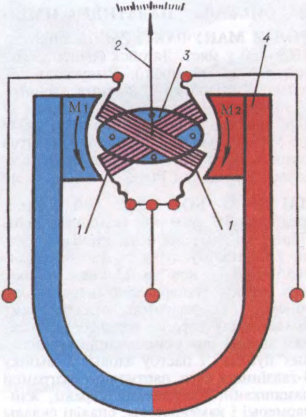 Схема магнітаэлектрычнага лагометра: 1 — рухомыя шпулі; 2 — стралка, прымацаваная да рухомай часткі прылады; 3 — асяродак, які стварае неаднароднае па зазоры магнітнае поле; 4 — пастаянны магніт; M1, M2 — вярчальныя моманты.