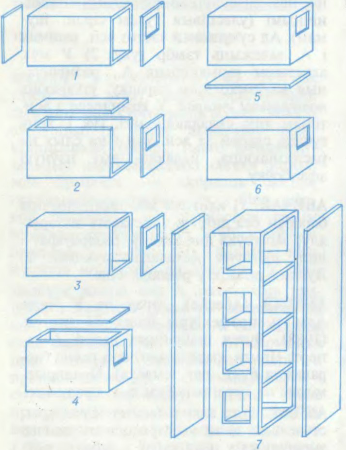 Аб’ёмнаблочнае домабудаванне. Віды аб’ёмных блокаў: 1 — з прыстаўнымі тарцовымі сценамі; 2 — з панэлямі столі і вонкавай сцяны; 3 — з панэллю вонкавай сцяны; 4 — з панэллю столі тыпу «шклянка»; 5 — з панэллю падлогі тыпу «каўпак»; 6 — замкнёны маналітны блок; 7 — чатырохпавярховы блок з прыстаўнымі бакавымі сценкамі.