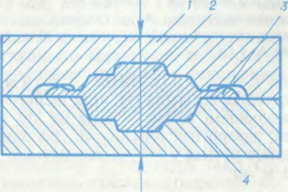 Аб’ёмная штампоўка: 1 — верхняя частка штампа; 2 — выраб ва ўнутранай частцы штампа; 3 — завусенец (лішак металу); 4 — ніжняя частка штампа.