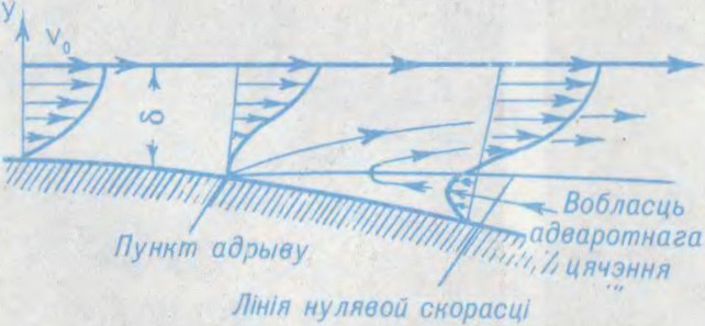 цячэнне, пры якім паток вадкасці (газу), што абцякае цела, адрываецца ад яго паверхні з утварэннем віхравой зоны. Узнікае каля паверхні цела з крывалінейнымі ўтваральнымі (напр., сферы, крыла самалёта), пры наяўнасці вязкага пагранічнага слоя і павышэння ціску ў напрамку цячэння. Уплывае на гідрадынамічныя (аэрадынамічныя) характарыстыкі целаў, а пры звышгукавых скарасцях цячэння і на цеплавы рэжым.