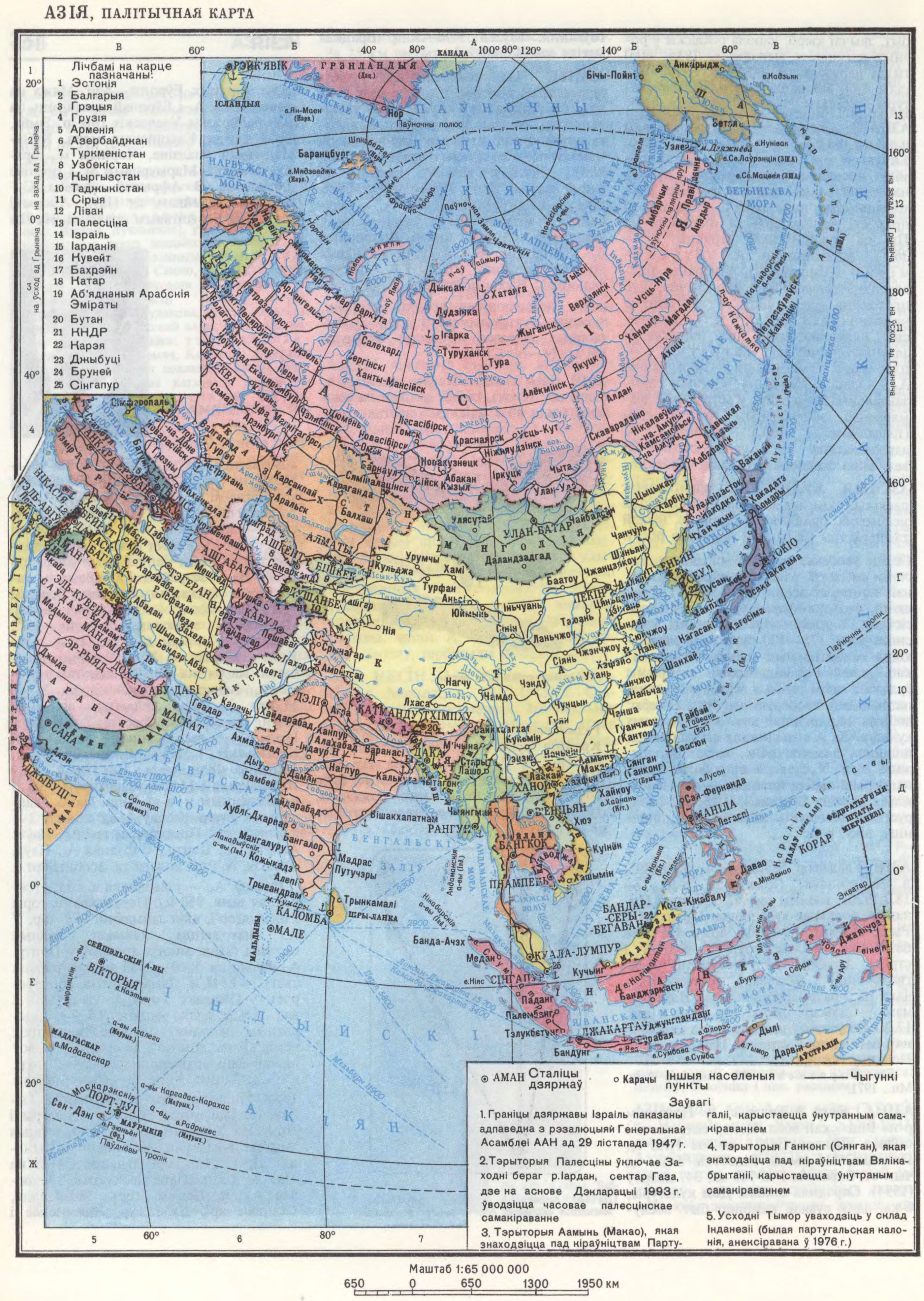 Палітычны падзел. У межах Азіі і на прылеглых а-вах размешчаны дзяржавы: Аб’яднаныя Арабскія Эміраты, Азербайджан, Аман, Арменія, Афганістан, Бангладэш, Бахрэйн, Бруней, Бутан, В’етнам, Грузія, ч. Егіпта, Ізраіль, Іарданія, Індыя, Інданезія, Ірак, Іран, Йемен, Казахстан, Камбоджа, Карэйская Народна-Дэмакратычная Рэспубліка, Катар, Кіпр, Кітай, Кувейт, Кыргызстан, Лаос, Ліван, Малайзія, Мальдывы, Манголія, М’янма, Непал, Пакістан, Палесціна (тэр.Зах. берага р. Іардан і сектар Газа), Расійская Федэрацыя, Рэспубліка Карэя, Саудаўская Аравія, Сінгапур, Сірыя, Таджыкістан, Тайланд, б.ч. Турцыі, Туркменістан, Філіпіны, Шры-Ланка, Японія, а таксама тэр. Аамынь (уладанне Партугаліі) і Сянган (Ганконг; уладанне Вялікабрытаніі).