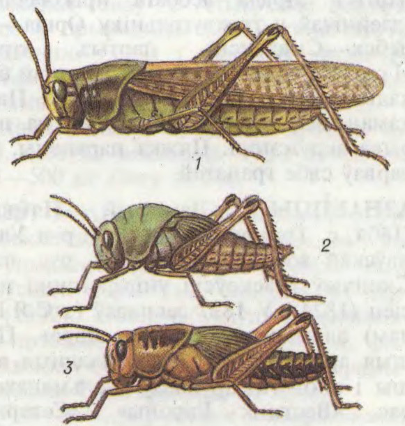 Азіяцкая саранча. 1 — дарослая; 2 — адзіночная форма лічынкі; 3 — стадыя фаза лічынкі.