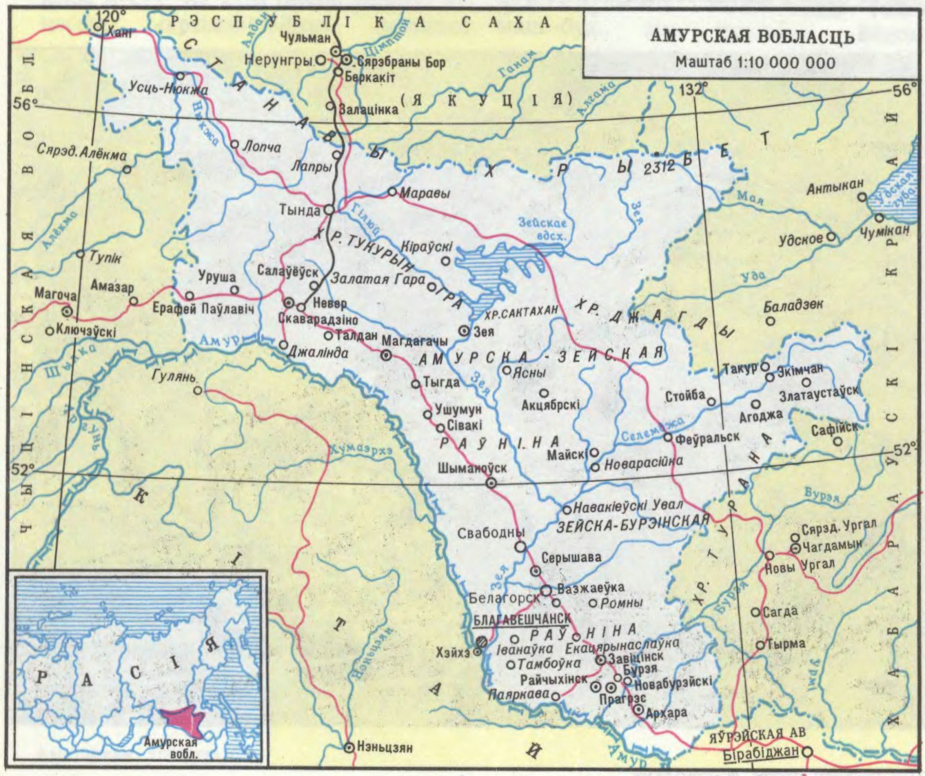 на Пд Д. Усходу Расійскай Федэрацыі. Утворана 20.10.1932. Пл. 363,7 тыс.км². Нас. 1049,1 тыс.чал. (1994), гарадскога 65%. Цэнтр — г.Благавешчанск. Буйныя гарады: Белагорск, Райчыхінск, Зея, Шыманоўск, Свабодны, Тында.