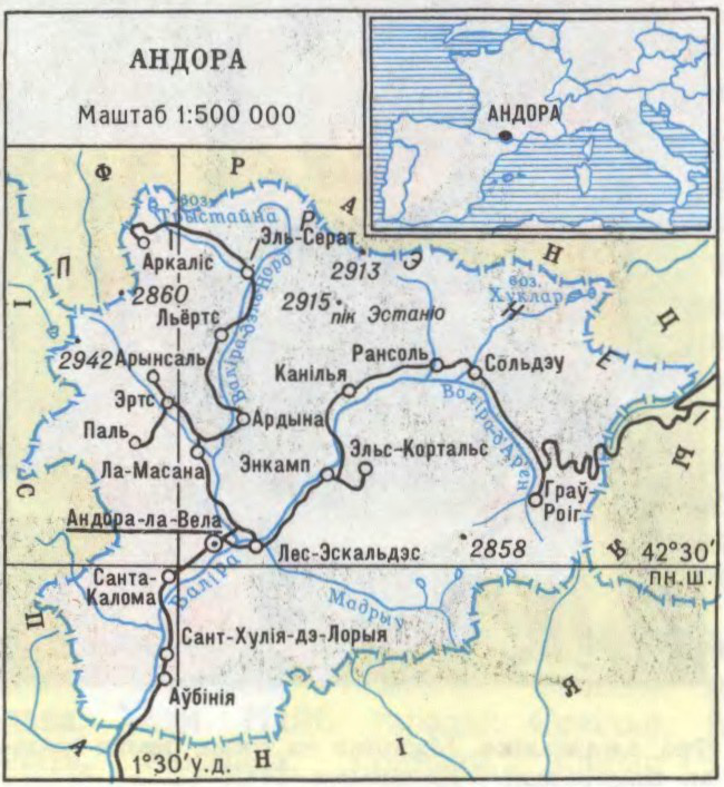 Княства Андора (каталанскае Principat d’Andorra, ісп. Principado de’Andorra, франц. Principauté d’Andorre), дзяржава на ПдЗ Еўропы ва ўсх. Пірэнеях паміж Іспаніяй і Францыяй. Пл. 465 км², нас. 64 тыс. чад. (1993). Сталіца — г.Андорала-Вела. Афіц. мова каталанская, выкарыстоўваецца таксама ісп. і французская. Насельніцтва: іспанцы (61%), андорцы (30%), французы (6%) і інш. Большасць вернікаў — католікі. Сярэдняя шчыльн. насельніцтва 137 чал. на 1 км². У адм.-тэр. адносінах Андора падзяляецца на 7 абшчын. Афіцыйна Андора — суверэннае парламенцкае княства, фактычна — рэспубліка. Заканадаўчы орган — аднапалатны Ген. савет, які выбіраецца ўсеаг. прамым галасаваннем на 4 гады. Выканаўчую ўладу ажыццяўляе Выканаўчы савет (урад) з 5 міністраў. Узбр. сіл не мае. Існуюць невял. паліцэйскія фарміраванні для аховы грамадскага парадку.