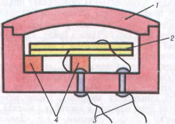П’езаэлектрычны ларынгафон 1 — частка корпуса, якая прыціскаецца да гартані; 2 — п’езаэлемент з апорамі 4; 3 — вывады электрычнага напружання гукавой частаты.