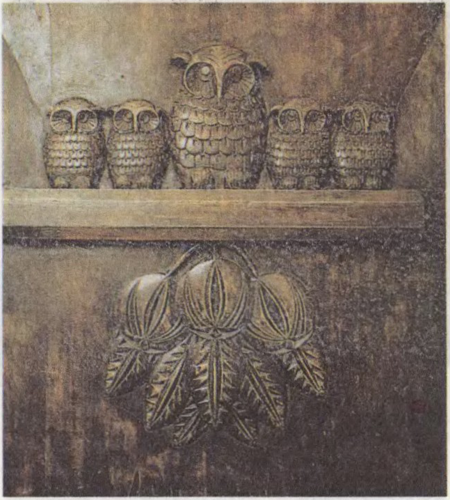 Да арт. Абрамцава-Кудрынская разьба. А.Паленава. Совы (уверсе), шафка. 1880-я гады.