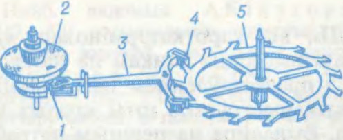 Да арт. Анкер. Анкерны ход гадзінніка: 1 — імпульсны камень; 2 — падвойны ролік; 3 — анкер, ці анкерная вілка; 4 — палеты, ці штыфты, анкера; 5 — анкернае кола.
