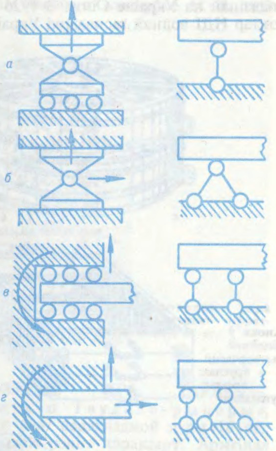 Схемы апораў плоскіх стрыжнёвых сістэм: а — шарнірная рухомая; б — шарнірная нерухомая; в — зашчэмленая рухомая; г — зашчэмленая нерухомая. Стрэлкамі паказаны апорныя рэакцыі.