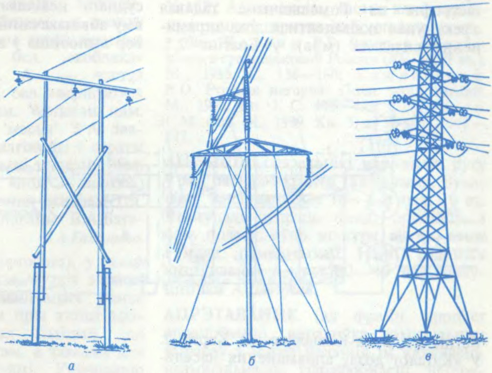 Апоры ліній электраперадачы: а — драўляная свабоднастаячая П-падобная; б — жалезабетонная аднастоечная з адцяжкамі; в — металічная двухланцуговая.