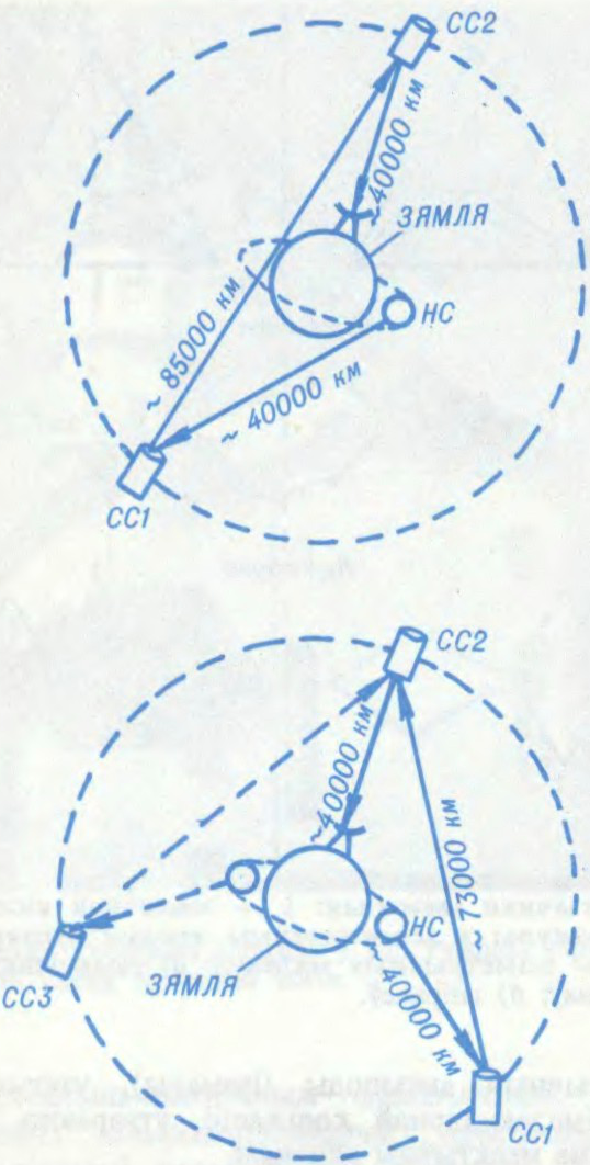 Аптычная сувязь: часткі зямной паверхні (2 СС); усёй Зямлі (3 СС); НС — нізкалятаючы спадарожнік (200 км над Зямлёй); СС — сінхронны спадарожнік (36—40 тыс. км над Зямлёй).