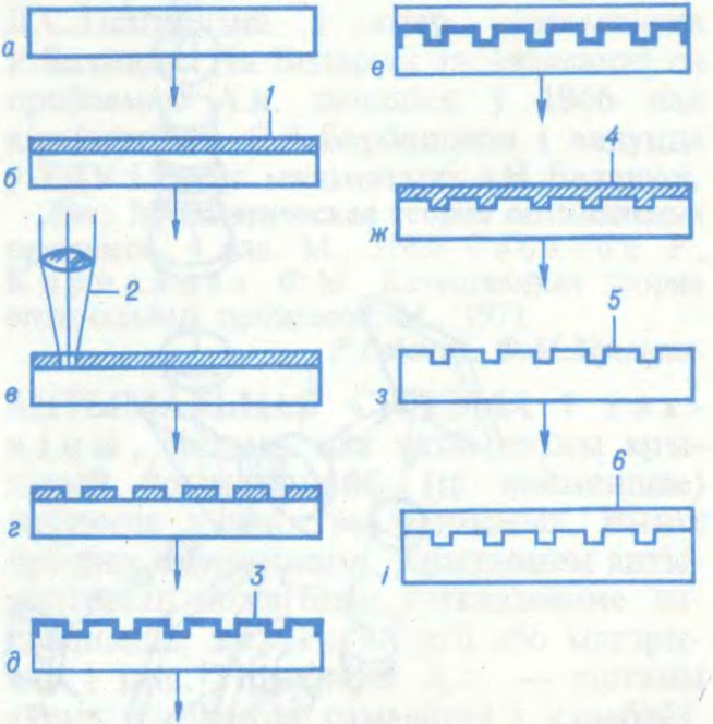 Асноўныя стадыі вырабу аптычнага дыска (арыгінала) і копіі з пастаяннай (несціральнай) сігналаграмай: а — зыходная дыскавая падложка; б — пасля нанясення на падложку слоя фотарэзісту 1; в — экспанаванне вярчальнага дыска факусіраваным лазерным выпрамяненнем 2; г — пасля праяўлення экспанаванага фотарэзісту; д — пасля металізацыі слоем серабра 3; е — пасля вырабу першага арыгінала металічнага дыска (звычайна нікелевага); ж — зыходная падложка дыска-копіі са штампам 4, вырабленым з металічнага дыска-арыгінала; з — пасля штампоўкі і наступнага пакрыцця падложкі дыска-копіі слоем металу 5 (звычайна алюмінію); і — пасля нанясення ахоўнага слоя 6 на металічны слой (гатовы дыск-копія).