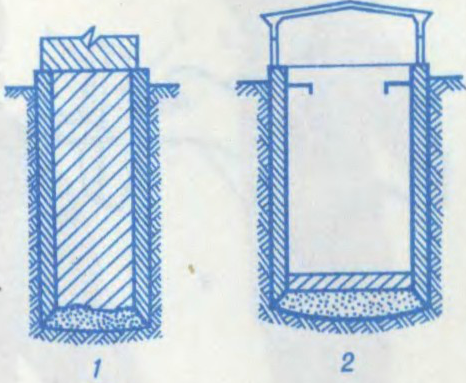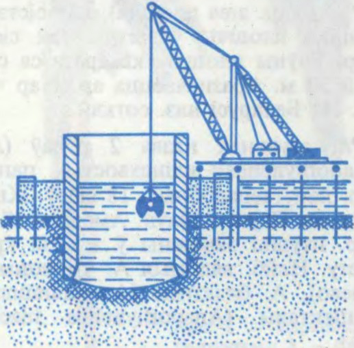 Апускны калодзеж: 1 — цалкам запоўнены бетонам (калодзеж-апора); 2 — часткова запоўнены бетонам (калодзеж—заглыбленае збудаванне).Выманне грунту з апускнога калодзежа грэйферам.