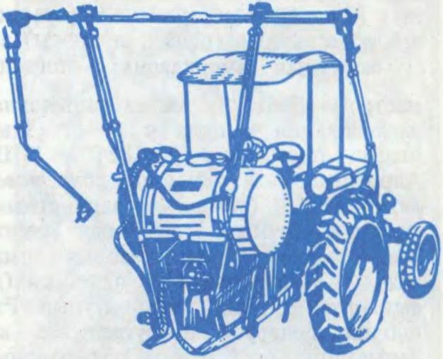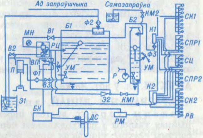 Навясны універсальны апырсквальнік ОН-400.Прынцыповая схема апырсквальніка ОПШ-15М: Б1, Б2 — бакі асноўны і дадатковы; П — помпа; РЦ — рэгулятар ціску напорнай магістралі; МН — манометр; К1, К2 — калектары напорны і зліўны; Ф1, Ф2, Ф3 — фільтры; В1, В2, В3 — вентылі; УМ — узроўнямеры; КМ1, КМ2 — краны; Р — рухавік мяшалкі; Э1, Э2 — эжэктары; СЦ, СПР1, СПР2, СК1, СК2 — цэнтральная, прамежкавыя і крайнія секцыі штангі; РВ — распыляльнік; ВП — выканаўчае прыстасаванне; ДС — датчык скорасці; РМ — расходамер; БК — блок кіравання.