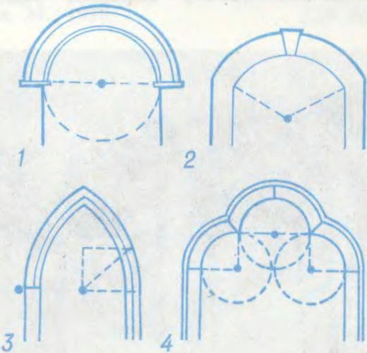 Аркі: 1 — паўцыркульная; 2 — з замковым каменем; 3 — спічастая; 4 — трохлопасцевая.Аркі брамы Кальварыйскага касцёла ў Мінску.