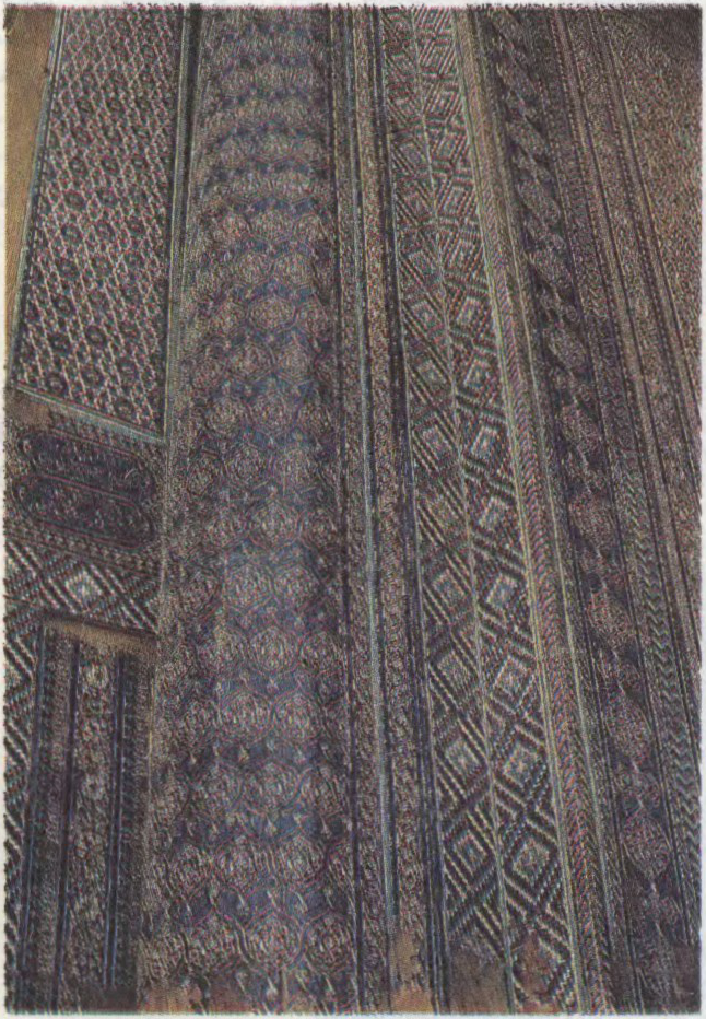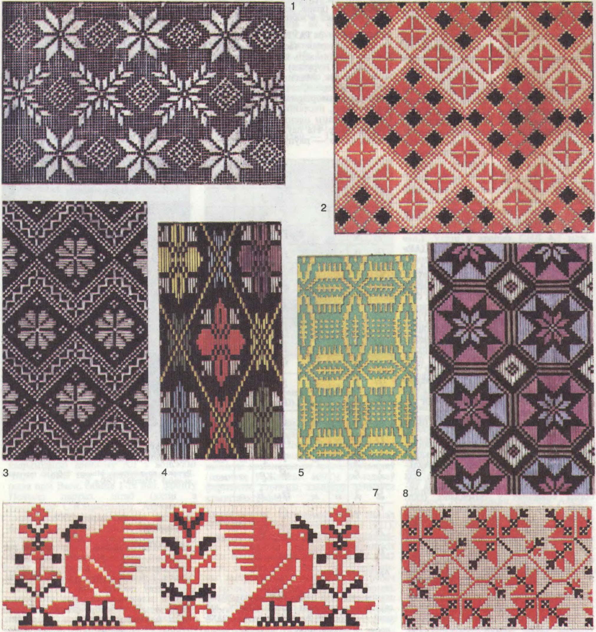 Ручнік з арнаментам. Мінская фабрыка мастацкіх вырабаў «Мастра». 1990-я г.Да арт. Арнамент. 1. Вязанне. 1920. Магілёўская вобл. 2. Вышыўка. 18 ст. 3. Тканіна. 1920. Гродзенская вобл. 4, Тканіна. 1950. Гомельская вобл. 5. Тканіна. Канец 19 ст. Мінская вобл. 6. Посцілка. 1900. Піншчына. 7. Фрагмент ручніка. 1934. Талачынскі р-н, Віцебская вобл. 8. Вышыўка. 1920. Брэсцкая вобл.Да арт. Арнамент. Франтыспіс Карана Аргун-шаха. Егіпет. 1368—88.Да арт. Арнамент. Ворсавы дыван «Мараза». Шырванская група. Пач. 19 ст.Да арт. Арнамент. Маёлікавая абліцоўка сцен у палацы Таш-Хаўлі ў Хіве. 1830-я г.