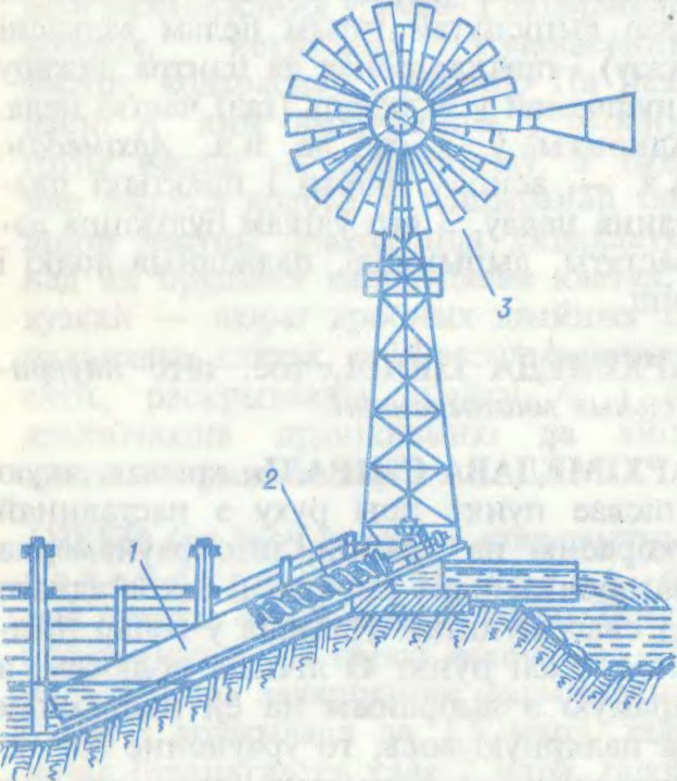 Выкарыстанне архімедавага вінта для перамяшчэння вады: 1 — труба; 2 — архімедаў вінт; 3 — ветравы рухавік.