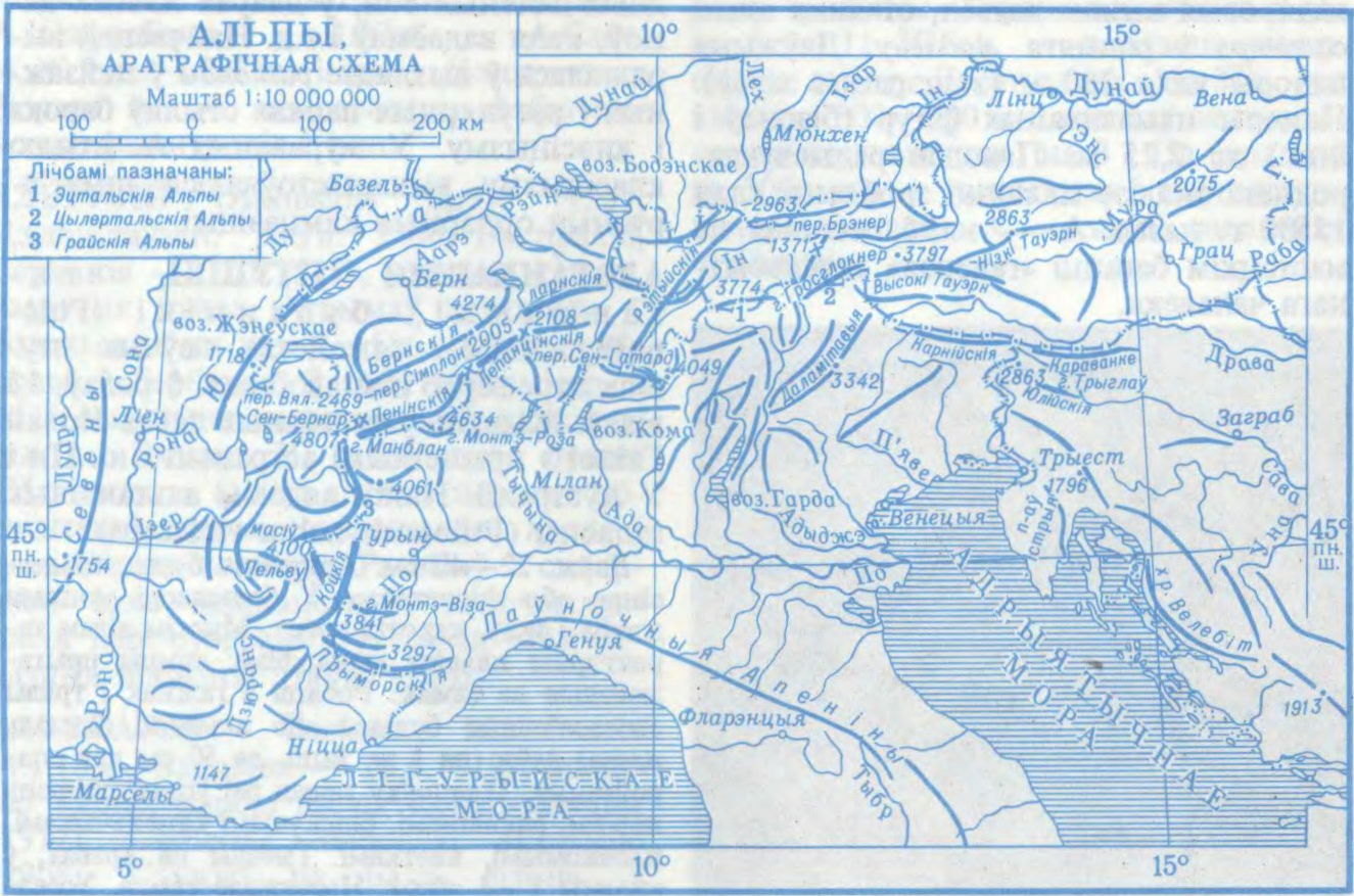 найвышэйшая горная сістэма Зах. Еўропы на тэр. Францыі, Італіі, Швейцарыі, Аўстрыі, Ліхтэнштэйна, Германіі і Славеніі. Даўж. каля 1200 км, шыр. да 260 км, найб.выш.г. Манблан (4807 м). Альпы — складаная сістэма горных масіваў і хрыбтоў, што працягнуліся дугой ад Міжземнага м. да Сярэднедунайскай раўніны. Папярочная даліна між азёрамі Бодэнскім і Кома падзяляе Альпы на больш вышынныя Зах. Альпы і больш нізкія і шырокія Усходнія. У Заходніх вылучаюць Прыморскія, Коцкія, масіў Пельву, Грайскія, Савойскія (з масівам Манблан), Бернскія і інш. Горны ланцуг Усходніх Альпаў прадстаўлены Рэтыйскімі, Эцтальскімі, Цылертальскімі Альпамі, Высокім і Нізкім Таўэрнам. Альпы належаць да маладых складкавых структур альпійскага арагенезу (гл.Альпійская складкавасць). Характэрны зубчатыя грабяні, глыбокае расчляненне, вял. пашырэнне ледавіковых формаў рэльефу (гл.Альпійскі рэльеф). Восевая зона сфарміравана стараж. крышталічнымі (гнейсы, слюдзяныя сланцы), магматычнымі (граніты) і метамарфічнымі (кварцава-філітавыя сланцы) пародамі. Перадгор’і Альпаў складзены з вапнякоў, мергеляў, даламітаў, філітаў і маладых маласавых фармацый. Карысныя выкапні: жалезныя, медныя, уранавыя руды, магнезіты, баксіты, каменная соль, у невял. колькасці каменны і буры вугаль.