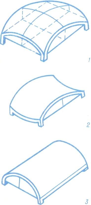 Тыпы паверхняў абалонак у будаўніцтве: 1 — дадатнай, 2 — адмоўнай, 3 — нулявой крывізны.