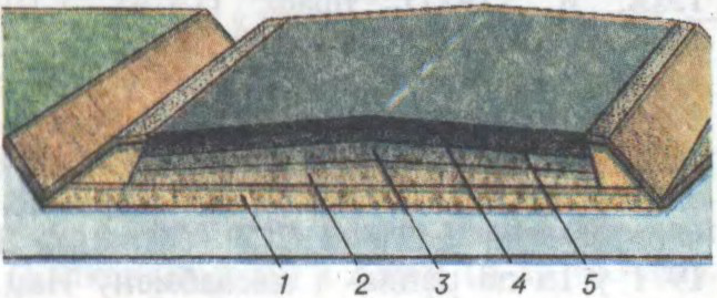 Дарожнае адзенне: 1 — дадатковы слой асновы; 2, 3 — слаі асновы; 4, 5 — ніжні і верхні слаі дарожнага пакрыцця.