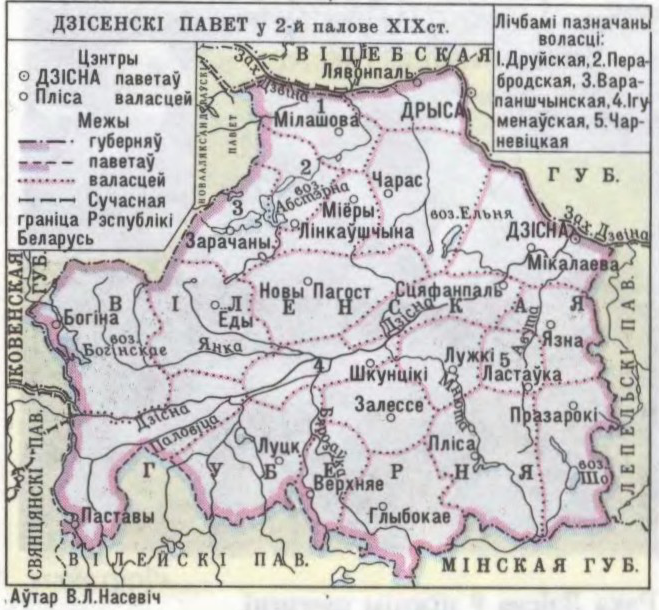 адм.-тэр. адзінка на тэр. Беларусі ў 18—20 ст. Утвораны ў крас. 1793 у Мінскай губ., з 1843 у Віленскай губ. Цэнтр — г.Дзісна. Пл. 507,8 кв. вёрст, нас. 208,3 тыс.чал. (1897). У 1886 у павет уваходзілі 2125 нас. пунктаў, 22 воласці: Богінская, Варапаншчынская, Верхненская (Вярхнянская), Глыбоцкая, Друйская, Залеская, Ігуменская, Іодкаўская (Ёдская), Лужкоўская (Лужэцкая), Луцкая, Лявонпальская, Міёрская (Мёрская), Мікалаеўская, Новапагосцкая, Пастаўская. Перабродская, Пліская, Празароцкая, Стафанпольская, Чарневіцкая, Чарэская, Язненская; заштатны г.Друя, 18 мястэчак. З 18.8.1919 да ліп. 1920 Дз. п. у Віцебскай губ. У 1921 у складзе Зах. Беларусі адышоў да Польшчы, уваходзіў у Віленскае ваяв. З 1939 у БССР, са снеж. ў Вілейскай вобл. Скасаваны 15.1.1940.