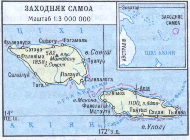 Незалежная Дзяржава Заходняе Самоа (самаанскае Malo Sa’oloto Tuto’atasi o Samoa i Sisifo, англ. Independent State of Western Samoa), дзяржава ў зах.ч. архіпелага Самоа ў Ціхім ак. (усх.ч. архіпелага займае ўладанне ЗША — Усходняе Самоа). Уключае а-вы Савайі (1,7 тыс.км2), Уполу (1,1 тыс.км2) і 7 дробных. Падзяляецца на 11 акруг. Пл. 2831 км2. Нас. 167 тыс.чал. (1993). Сталіца — г.Апія. Дзярж. мовы — самаанская і англійская. Нац. свята — Дзень незалежнасці (1 ліп.).