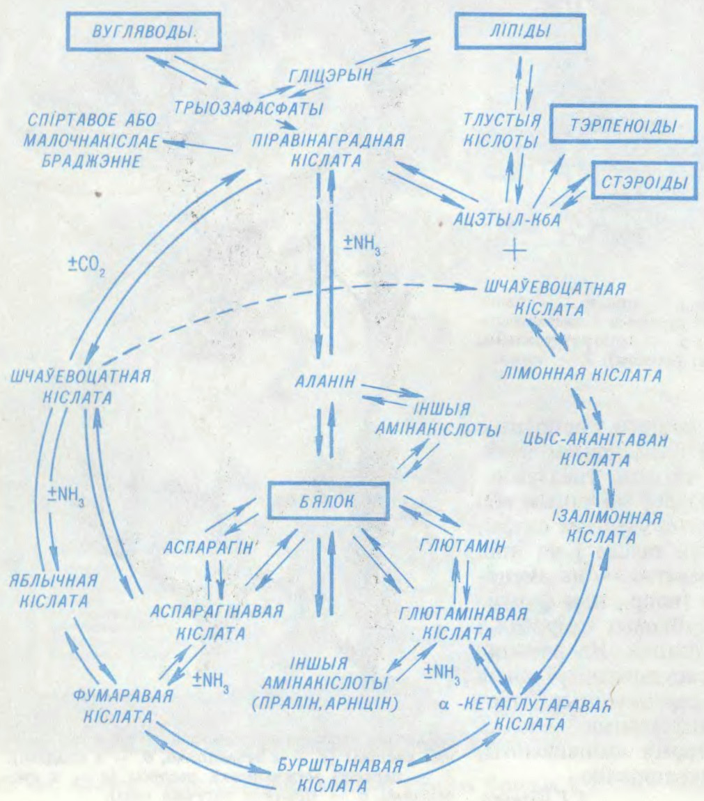 Ператварэнні рэчываў ад моманту іх паступлення ў арганізм да ўтварэння канчатковых прадуктаў распаду складаюць сутнасць т.зв. прамежкавага абмену рэчываў. Асн. яго этапы: ператраўленне і ўсмоктванне пажыўных рэчываў у страўнікава-кішачным тракце; дастаўка атрыманых рэчываў да розных органаў і тканак; іх перабудова, раскладанне і выкарыстанне для біясінтэзу спецыфічных рэчываў, клетак і тканак; раскладанне такіх рэчываў з утварэннем прамежкавых злучэнняў і канчатковых прадуктаў абмену; выдаленне апошніх з арганізма. Цэнтр. месца ў абмене рэчываў належыць цыклу трыкарбонавых кіслот, у якім перакрыжоўваюцца шляхі бялковага, вугляводнага, тлушчавага абмену (гл. схему). Найважн. прамежкавы прадукт абмену рэчываў — ацэтылкаэнзім A, які ўдзельнічае ва ўсіх працэсах анабалізму і катабалізму і аб’ядноўвае іх; асн. канчатковыя прадукты — H2O, CO3, NH3, мачавіна і інш. У рэгуляванні працэсаў абмену рэчываў гал. месца займаюць змены актыўнасці і інтэнсіўнасці сінтэзу клетак, абмен можа самарэгулявацца па прынцыпе адваротнай сувязі. Вял. значэнне ў рэгуляванні абмену рэчываў маюць біял. мембраны. У высокаарганізаваных жывёл рэгулюецца і каардынуецца нейрагумаральнай сістэмай пры ўдзеле біял. актыўных рэчываў (вітаміны, гармоны, медыятары і інш.). Разбалансаванне абмену рэчываў з’яўляецца прычынай або вынікам узнікнення разнастайных хвароб, фіксацыя змен у ім — важны дыягнастычны сродак. Гл. таксама Бялковы абмен, Вугляводны абмен, Тлушчавы абмен, Мінеральны абмен.