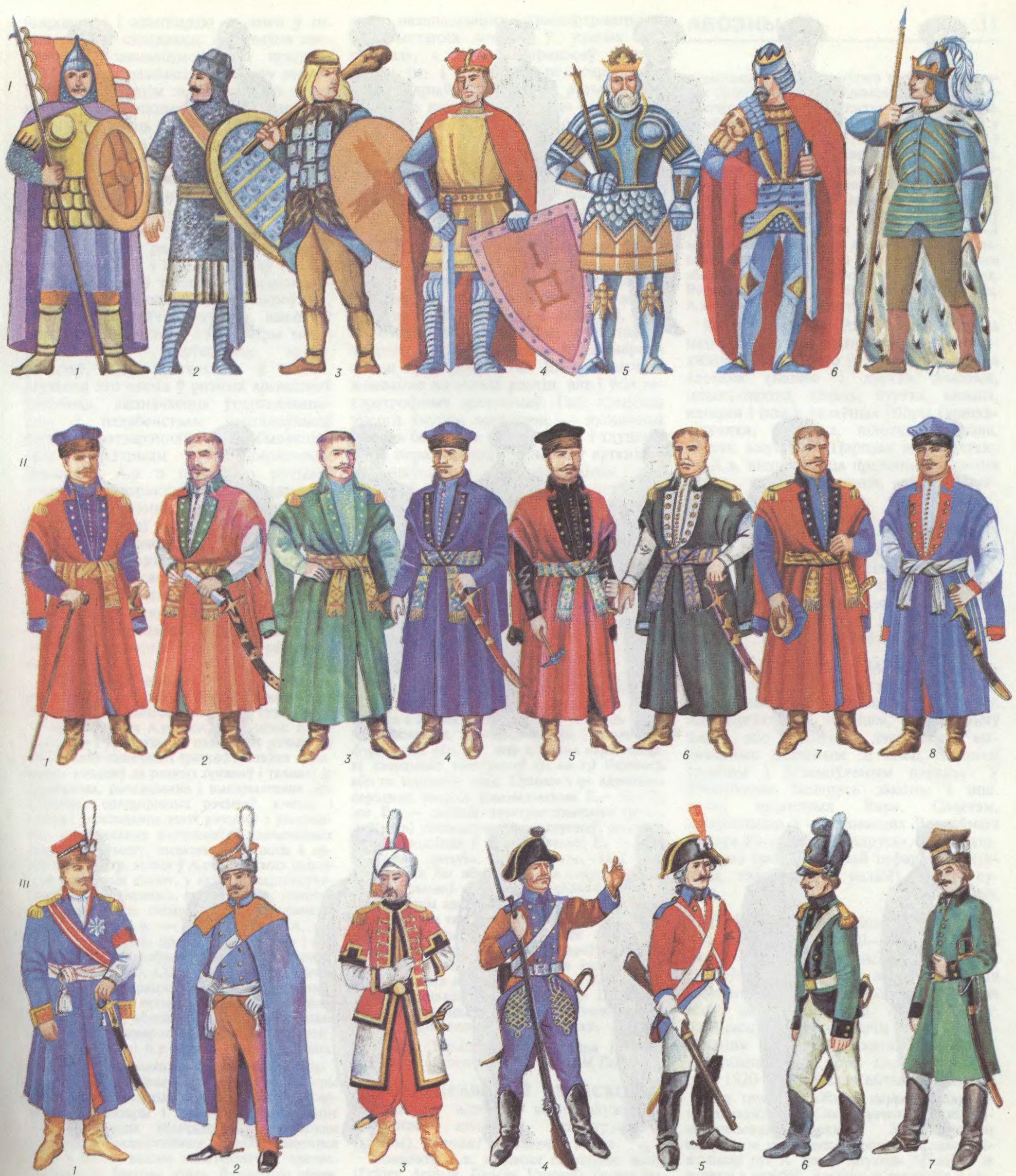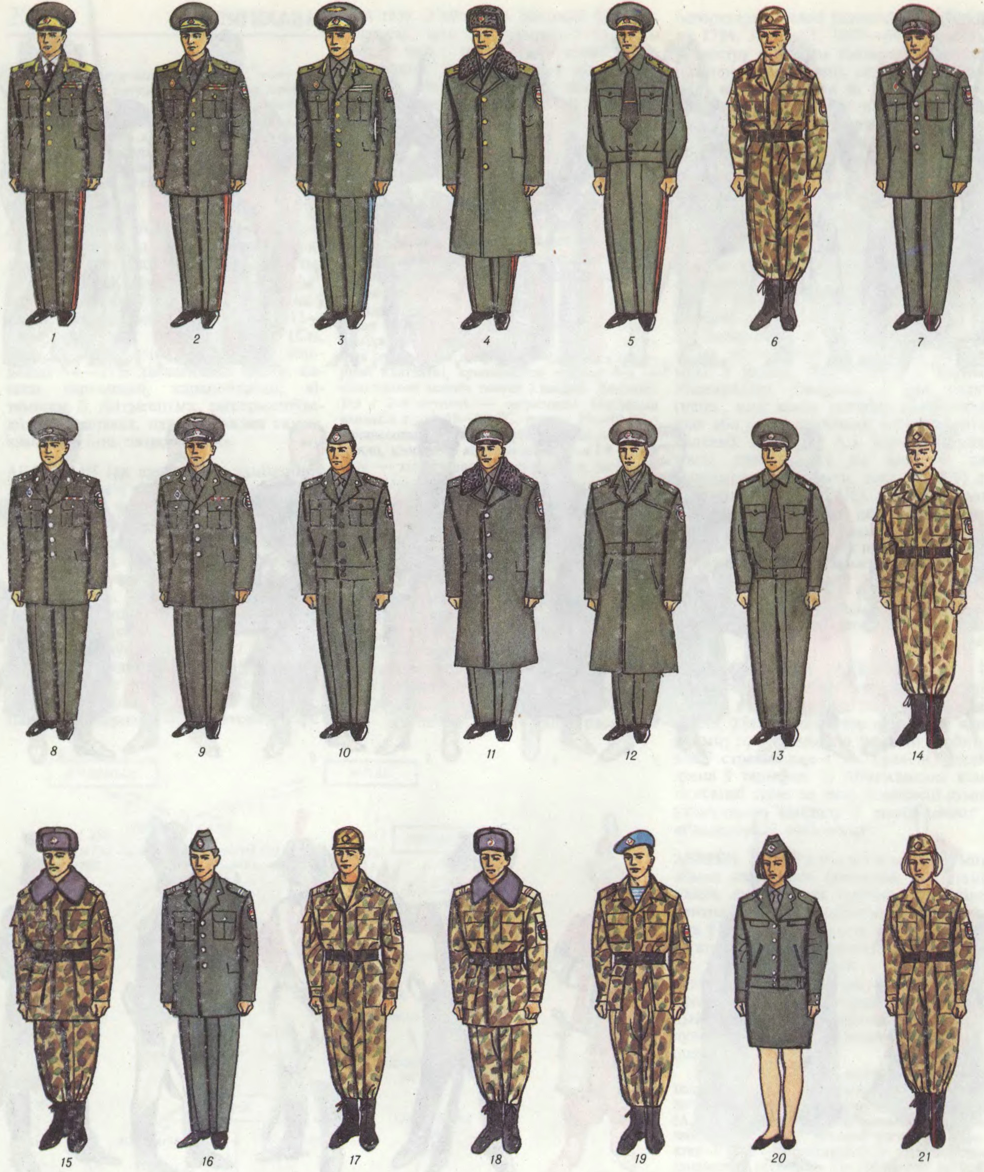 Да арт. Абмундзіраванне вайсковае. I. Адзенне воінаў 11—14 ст.: 1—2 — воіны Старажытнай Русі (11—12 ст.); 3 — літоўскі воін 14 ст.; 4—7 — военачальнікі Вялікага княства Літоўскага. II. Ваяводскія і павятовыя мундзіры беларускай шляхты (1780): 1 — Смаленскае ваяв.; 2 — Гарадзенскі пав.; 3 — Ашмянскі пав.; 4 — Віленскае ваяв.; 5 — Наваградскае ваяв.; 6 — Аршанскі пав.; 7 — Полацкае ваяв.; 8 — Берасцейскае ваяв. III. Адзенне войска Вялікага княства Літоўскага (1776—94): 1 — генерал-маёр; 2 — афіцэр 3-га палка пярэдняй стражы; 3 — ротмістр янычарскай харугвы Булавы вялікай; 4 — шараговы пешай гвардыі; 5 — шараговы коннай гвардыі; б — бамбардзір корпуса артылерыі; 7 — інжынер ваеннага корпуса інжынераў.Да арт. Абмундзіраванне вайсковае. Форма адзення ваеннаслужачых Узброеных Сіл Рэспублікі Беларусь. Для генералаў: 1 — летняя парадна-выхадная, 2 — летняя штодзённая (акрамя авіяцыі), 3 — летняя штодзённая (авіяцыі), 4 — зімовая штодзённая, 5 — летняя штодзённая (з кашуляй), 6 — летняя палявая; для афіцэраў і прапаршчыкаў: 7 — летняя парадна-выхадная, 8 — летняя штодзённая (акрамя авіяцыі), 9 — летняя штодзённая (авіяцыі), 10 — летняя штодзённая (з курткай і пілоткай), 11 — зімовая штодзённая (з фуражкай), 12 — летняя штодзённая (з плашч-паліто), 13 — летняя штодзённая (з кашуляй), 14 — летняя палявая, 15 — зімовая палявая; для салдат, сяржантаў і курсантаў ваенных вучылішчаў: 16 — летняя парадна-выхадная, 17 — летняя палявая, 18 — зімовая палявая; для салдат і сяржантаў паветрана-дэсантных войскаў: 19 — летняя палявая; для ваеннаслужачых жанчын: 20 — летняя штодзённая (з курткай і пілоткай), 21 — летняя палявая.