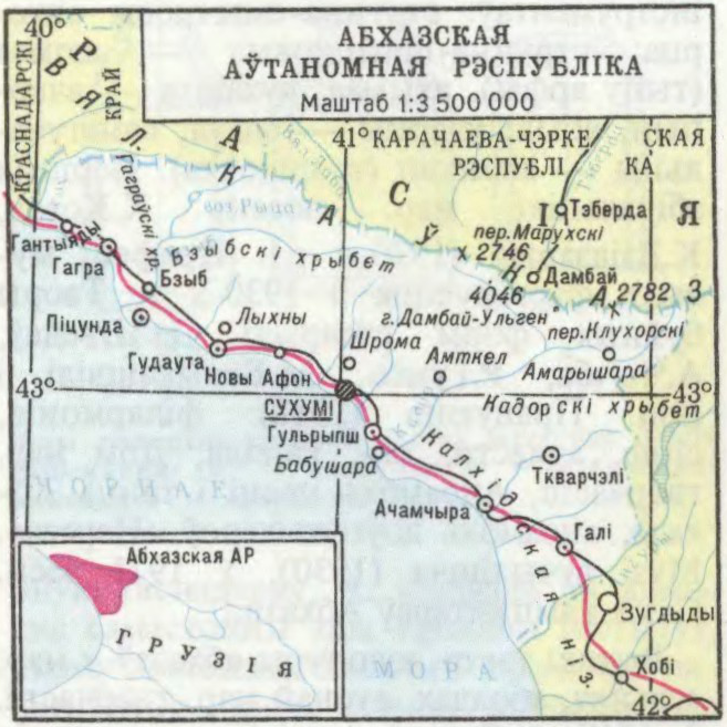 АБХА́ЗІЯ, Абхазская Аўтаномная Рэспубліка. Размешчана ў паўн.-зах.ч. Закаўказзя, на Чарнаморскім узбярэжжы Каўказа. Пл. 8,6 тыс.км². Нас. 533,8 тыс.чал. (1991), гарадскога 48%. Нац. склад у 1989: грузіны (25%), абхазы (18%), армяне (15%), рускія (14%), грэкі, украінцы і інш. Сярэдняя шчыльн. 61 чал. на 1 км², найб. 150—200 чал. на нізінах і ў перадгор’ях (93% усяго насельніцтва). Сталіца — г.Сухумі, найб. гарады Ткварчэлі, Гагра, Ачамчыра, Гудаута, Галі.