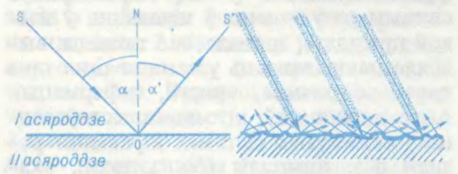 Калі няроўнасці паверхні падзелу меншыя за λ, наглядаецца люстраное адбіццё святла. Пры гэтым выконваюцца 2 законы адбіцця святла: адбіты прамень S′ ляжыць у адной плоскасці з праменем S, што падае, і перпендыкулярам ON да адбівальнай паверхні ў пункце падзення; вугал адбіцця Z′ роўны вуглу падзення α (