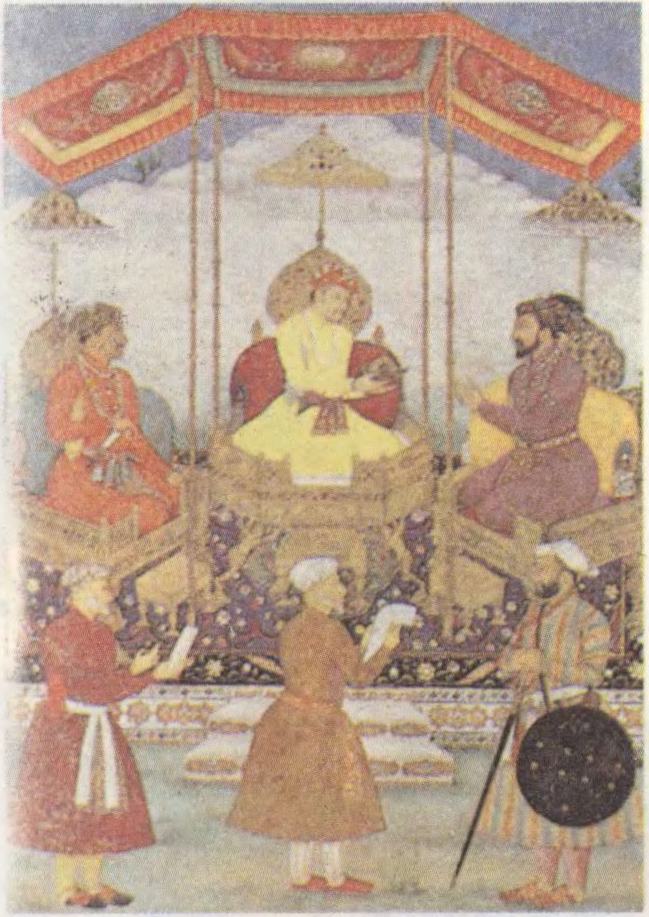 Акбар са сваім сынам Джахангірам і ўнукам Шахам-Джаханам. Мініяцюра. Каля 1630.